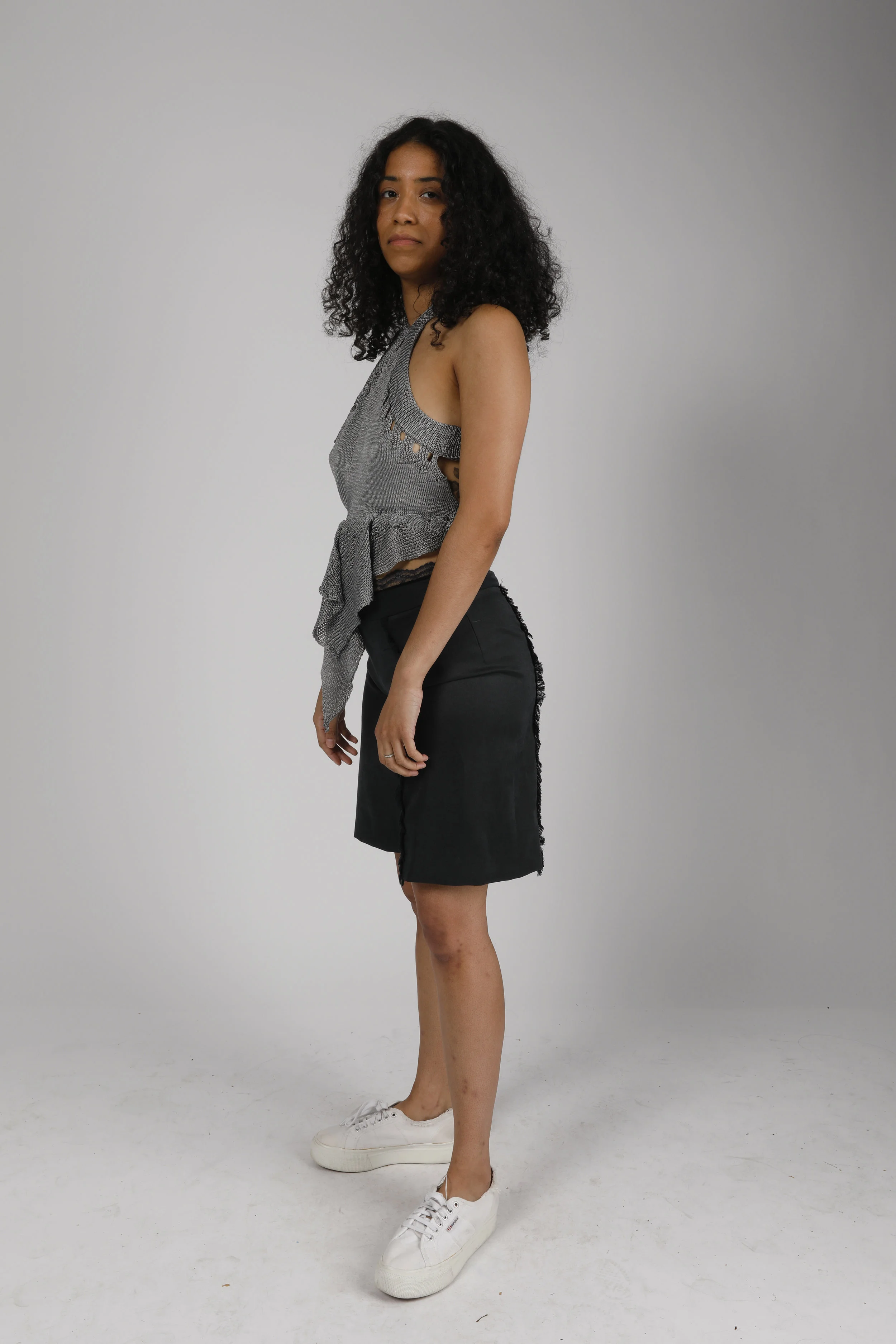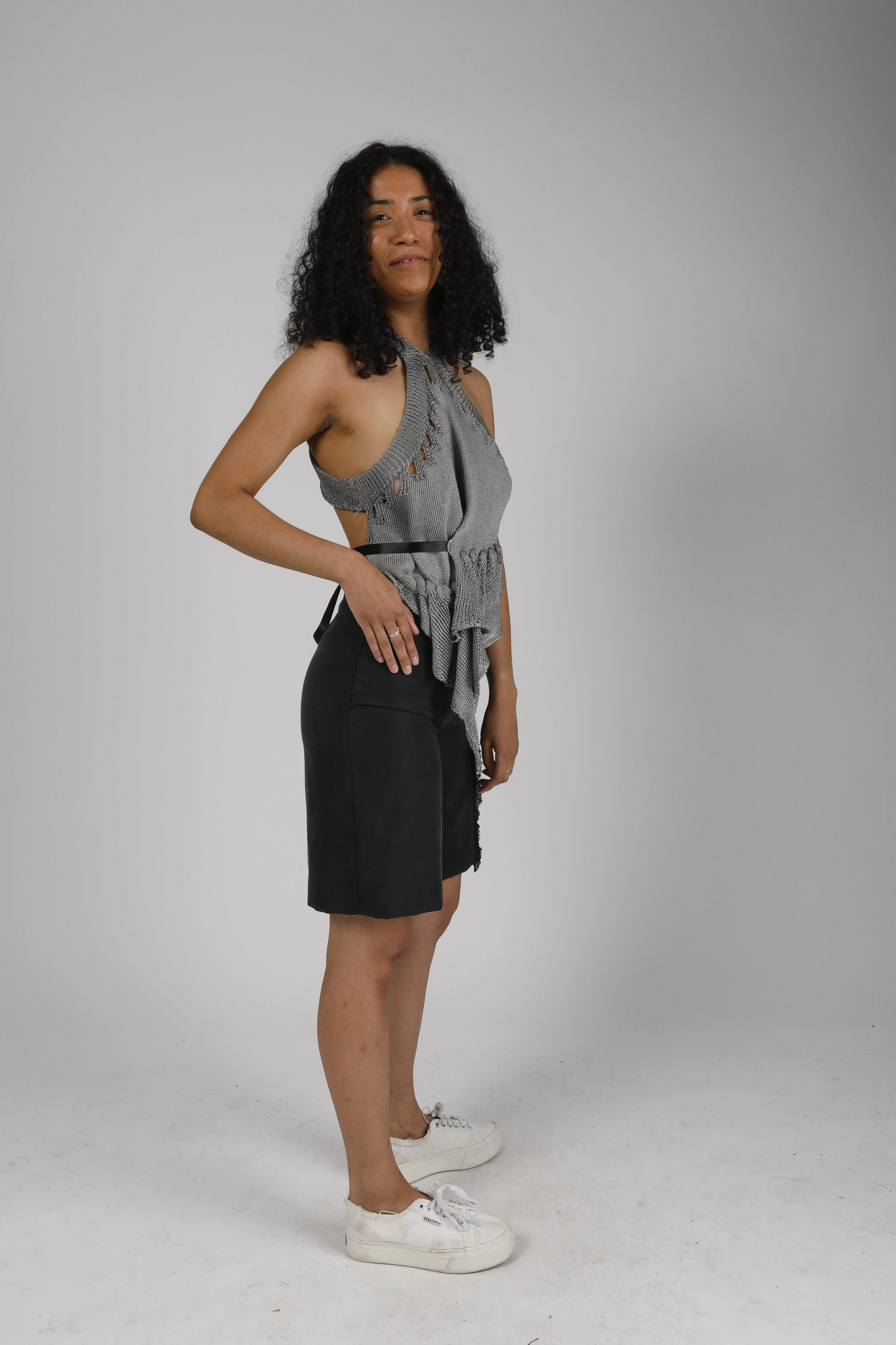 My knitwear design process began with the creation of a main swatch, which I draped on the form, paying attention to how its natural shape could be wrapped around the body. I then knit more pieces to fill in the gaps to create a cohesive garment.